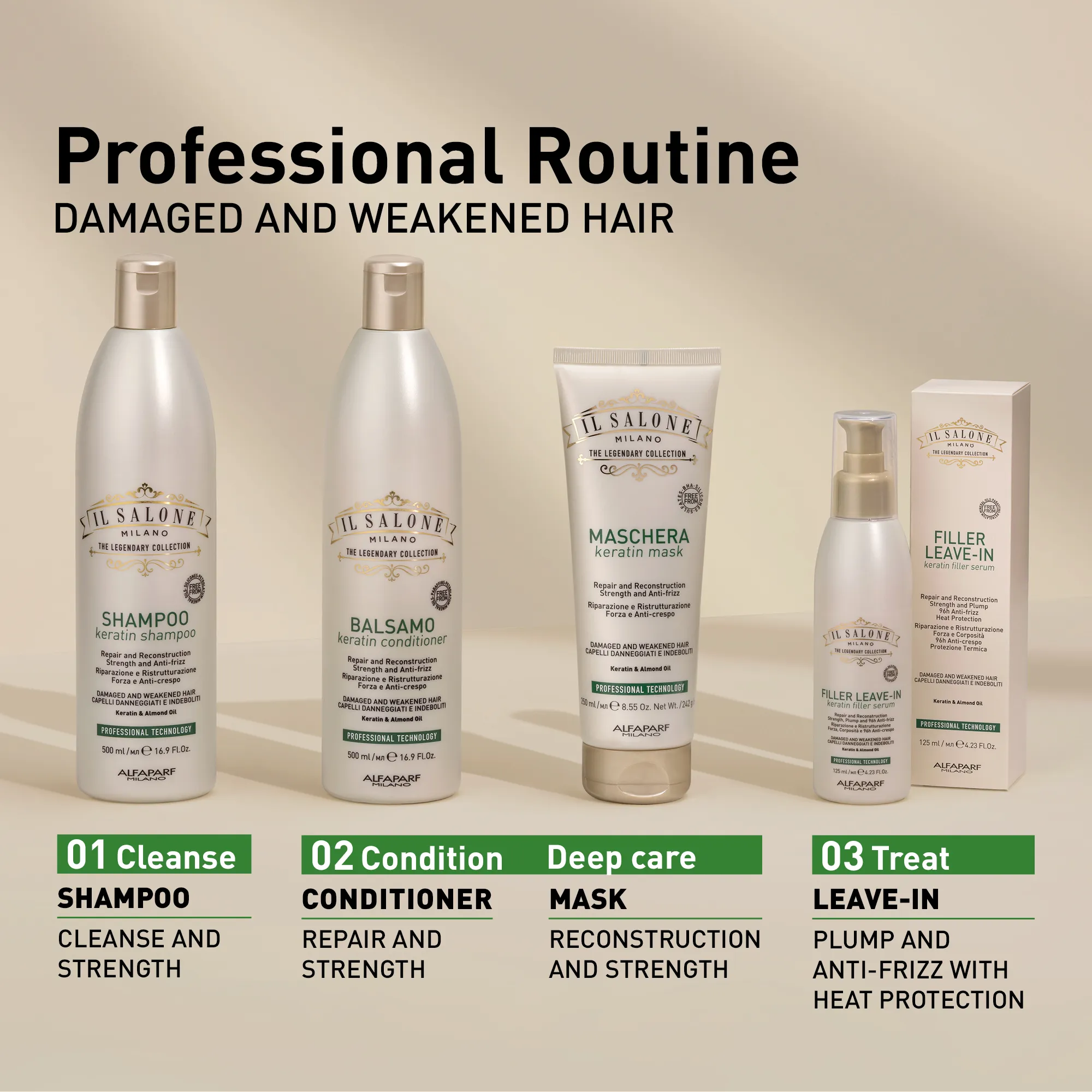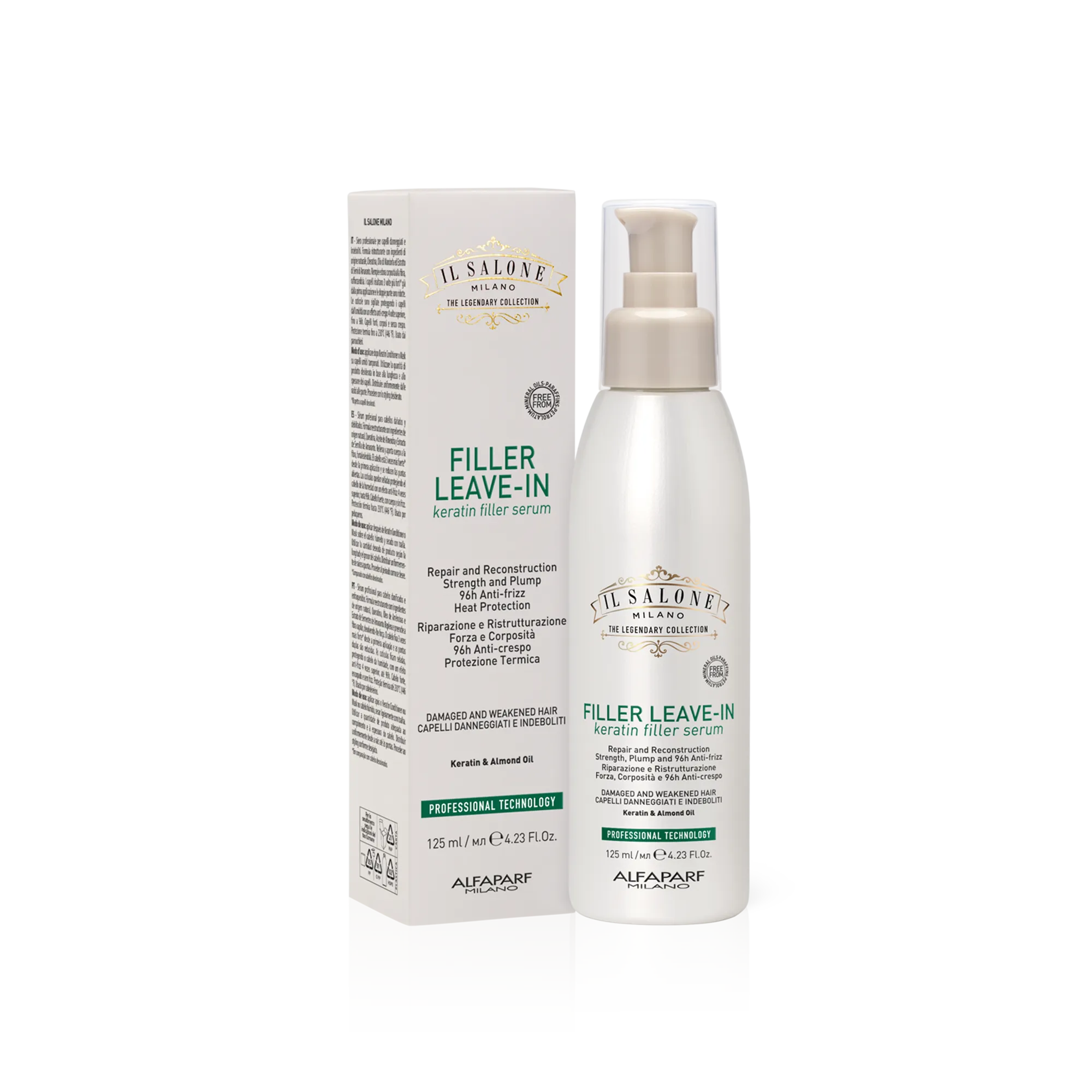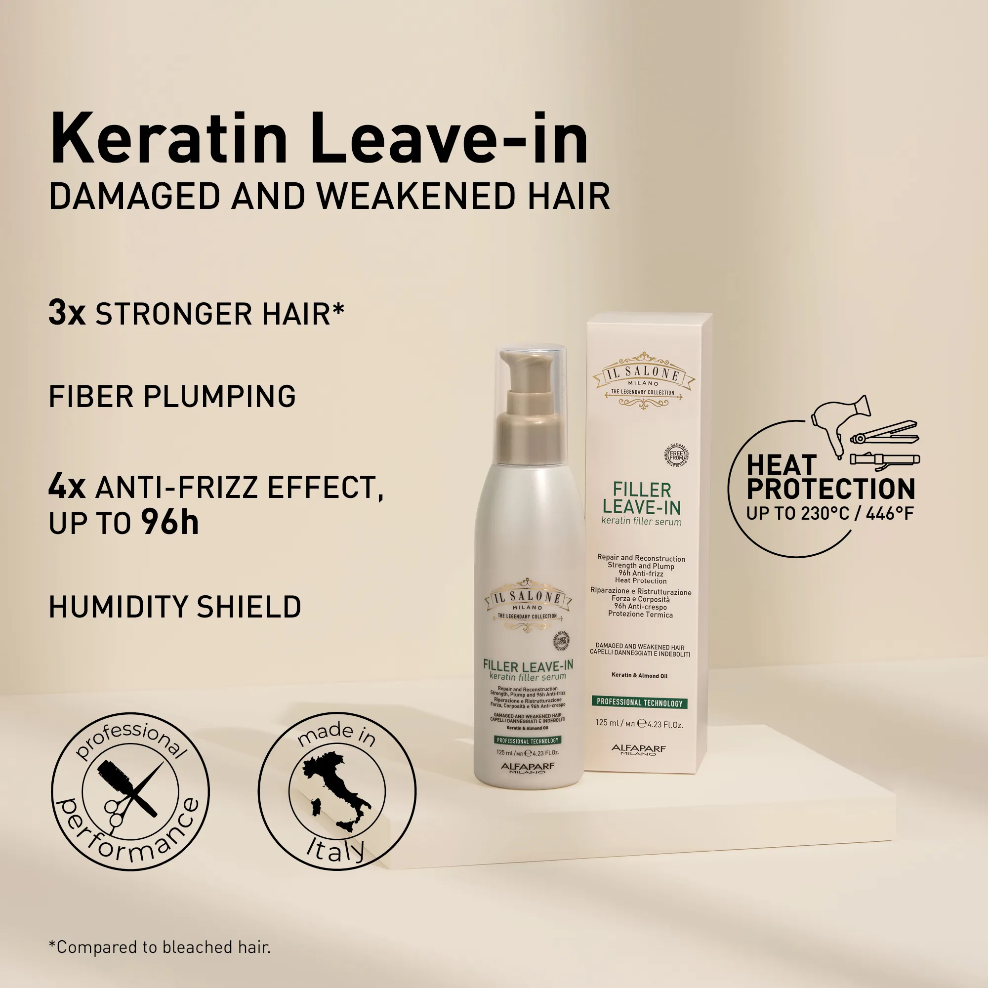 Профессиональная сыворотка для поврежденных и ослабленных волос. Восстанавливающая формула с ингредиентами натурального происхождения: Keratin, миндальным маслом и экстрактом семян амаранта. Она насыщает и уплотняет волокно волоса, придавая ему силу. Волосы становятся в 3 раза крепче* уже после первого применения, а количество секущихся кончиков уменьшается. Кутикулы уплотняются, защищая волосы от влажности с 4-кратным эффектом против пушения, до 96 часов. Сильные, уплотненные и не пушащиеся волосы. Термозащита до 230 °C (446 °F). Используется парикмахерами.