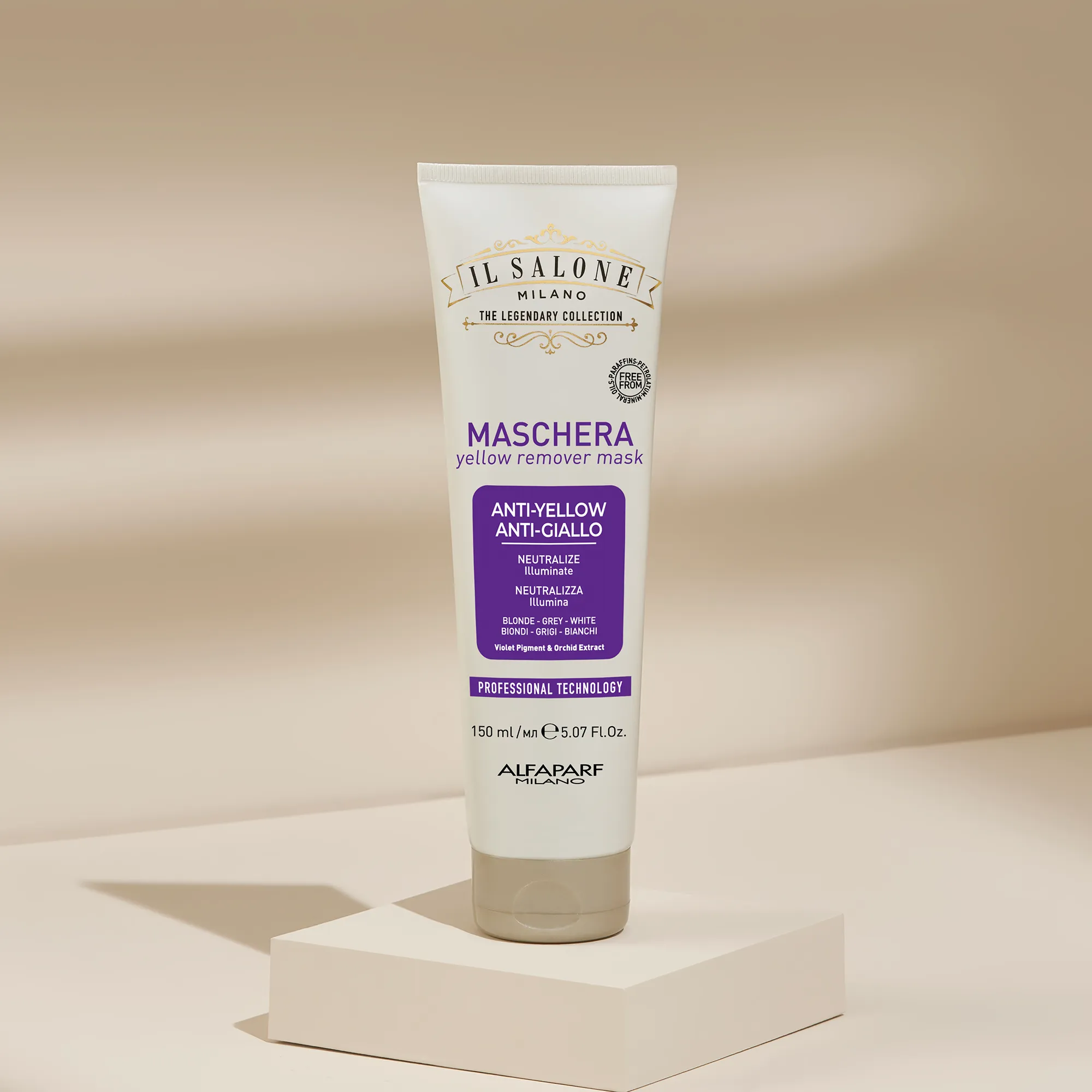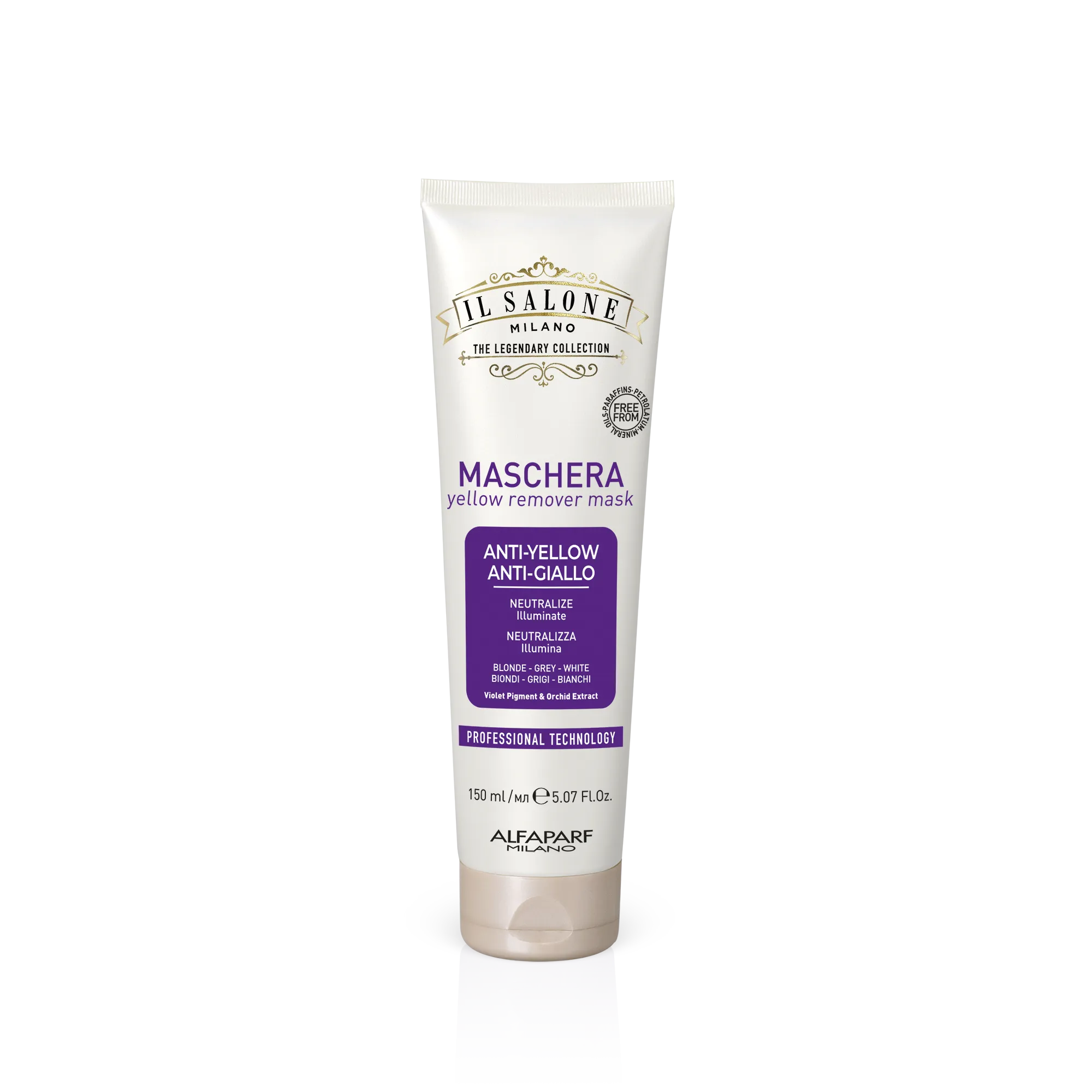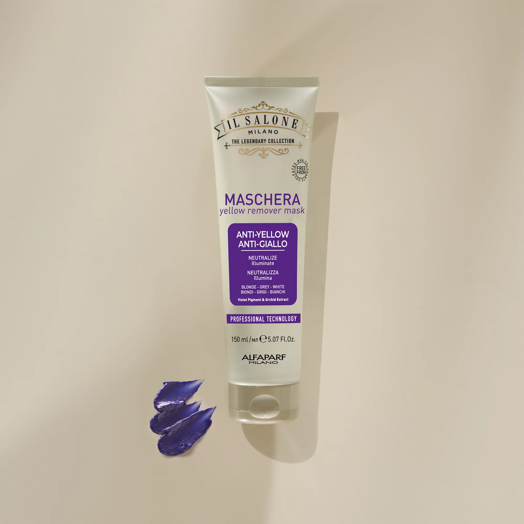 Профессиональная маска против желтизны. Созданная на основе системы Violet Care System, она нейтрализует нежелательные желтые оттенки и усиливает естественное сияние. Глубоко питает волосы, делая их мягкими и шелковистыми на ощупь. Фиолетовая формула.